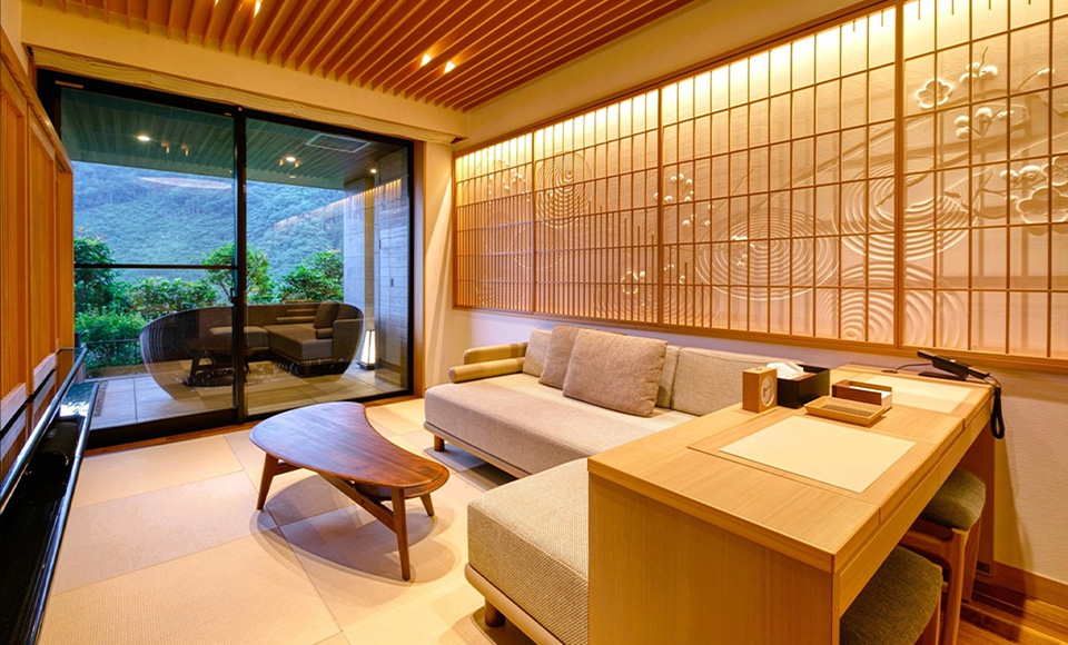 本館温泉棟の4階に位置しており、グループのご宿泊でもゆっくりとお寛ぎいただける広々とした和洋室です。響渓谷の絶景を眼前に臨むことができるお部屋と芝生広場に面したお部屋があり、ご家族連れでのご宿泊でも快適にお過ごしいただけるようにシャワーブースはゆったりとした空間となっております。 大きな梅のモチーフが印象的な寝室や家具が、大山ならではの空間を創出しています。また、小さいお子さまが添い寝できるようベッドスペースも工夫しました。小さいお子さま向けの 貸し出しサービスもあります。