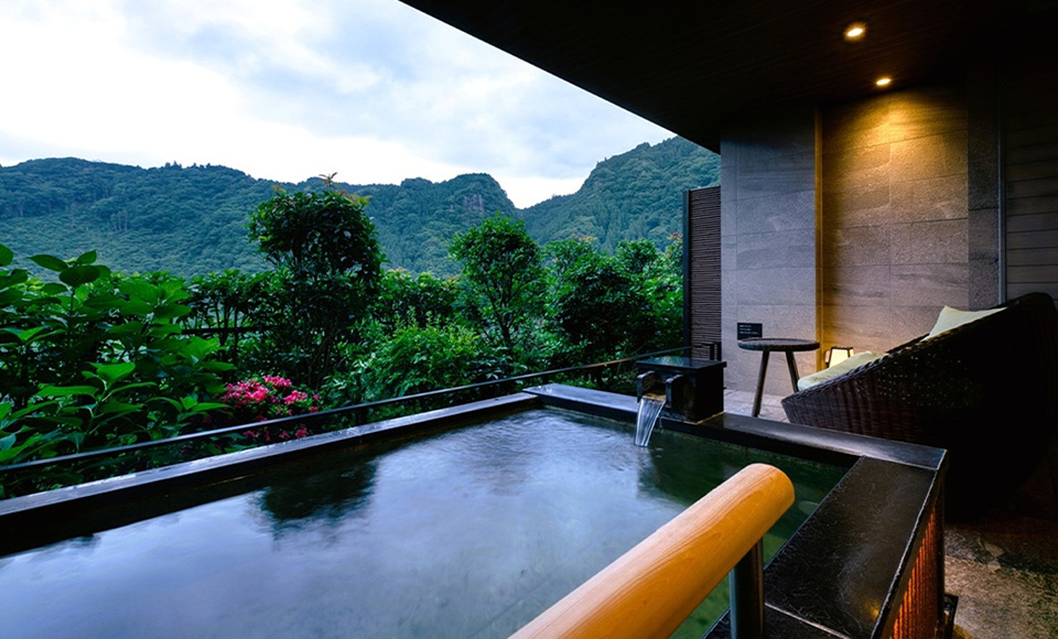別棟で独立した静かな離れ家です。響渓谷の絶景を満喫しながらお寛ぎいただける露天風呂と内風呂(ジャグジーバス)付きの二間続きのスイートルームです。